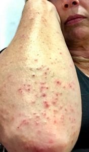 In September 2018, Dana had a full body rash – her shoulders, back, arms, legs, neck and chest – broke out in a bumpy, red, itchy rash. Contact with her uniform made it worse. The rash eventually got so bad, she would itch while sleeping at night, causing her sheets to become bloody. Dana developed scabs and sores from the itching that eventually turned into scars.