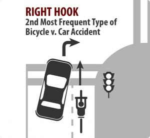 A second common type of bicycle crash is called the “right hook”. Here, the vehicle partially passes the cyclist, or gets barely ahead of the cyclist. The motorist then attempts a sudden tight turn – directly into the path of the cyclist cruising straight ahead. The car is not far enough ahead of the bicycle rider to make the turn safely. But the motorist turns anyway and expects the cyclist to adjust. Why does this happen? Maybe some drivers are surprised by the speed of the bicycle. In the cases I have handled with “right hooks”, the drivers frequently say, “I had the right of way”. These drivers think that once they nose ahead of the bike, they can do what they want – and the cyclist should slam on brakes and let them turn.