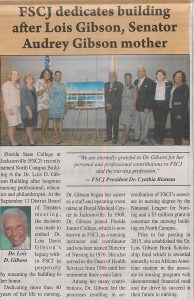 Florida State College of Jacksonville recently announced that it has named a major campus building for the late Dr. Lois Gibson. Dr. Gibson’s work educating nurses who have provided medical care to thousands in Northeast Florida included her years of dedicated service as FSCJ’s Director of Nursing and then Dean of Health Services.