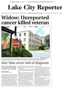 The Lake City Reporter ran a front-page article about a lawsuit involving the preventable death of Robert Taylor, a Vietnam veteran, who died from lung cancer almost three years ago. Mr. Taylor’s widow has retained our firm to initiate legal action against the federal government as her husband was not told of his lung cancer diagnosis until it was too late.