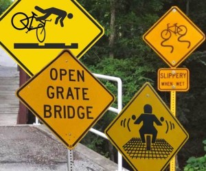 Metal grating bridges, storm drains, and sewer grates should be replaced and renovated. Until all are made completely safe for people riding bikes, warning signs should be installed in advance of these hazards to alert cyclists to the pending danger. Sadly, very, very few places have signs posted. But here are some pertinent warning signs posted around the U.S. (not all the signs are specifically intended for bicyclists or for metal grating):