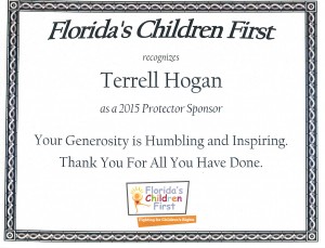 Bruce Maxwell served as Co-chair of the Host Committee for Florida’s Children First Northeast Florida Awards Banquet held in Jacksonville, Florida on Thursday, November 12, 2015 at the Haskell Building. Wayne Hogan of the firm also served as a member of the Host Committee. The firm was recognized for its continued support of Florida’s Children First, an advocacy group for under privileged and foster care children, and Terrell Hogan was given the above plaque in recognition of the firm’s continued support as a 2015 Protector Sponsor of the organization.