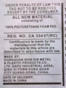 The Mainstays card table sets with a black padded metal folding table and four black padded metal folding chairs recalled are identified by a white label on the bottom of the chairs: “Made by: Dongguan Shin Din Metal & Plastic Products Co.”